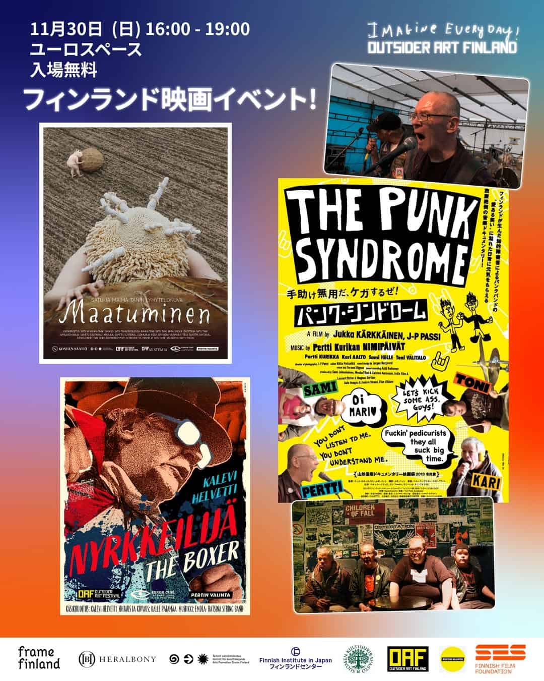 During the Outsider Art Finland festival in Tokyo, a film screening event will take place in Eurospace Cinema on Sunday 30th November at 4PM, it will feature short films by Maima & Satu Tani and Kalevi Helvetti & Kalle Pajamaa and The Punk Syndrome Documentary of the band Pertti Kurikan Nimipäivät. The event also includes live performances and a Q&A session with the artists and filmmakers.