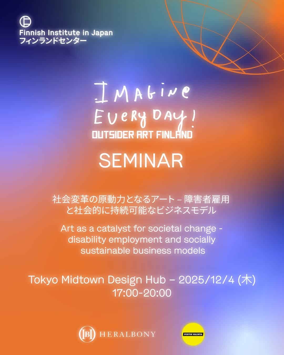 Imagine Everyday! – seminar connects creative businesses from Finland & Japan in co-creation and collaboration for sustainable social change. This seminar features keynote presentations from Finnish and Japanese Outsider Art Agencies and panel discussion of designing future visions for management and research within social change and diversity within the creative industries.